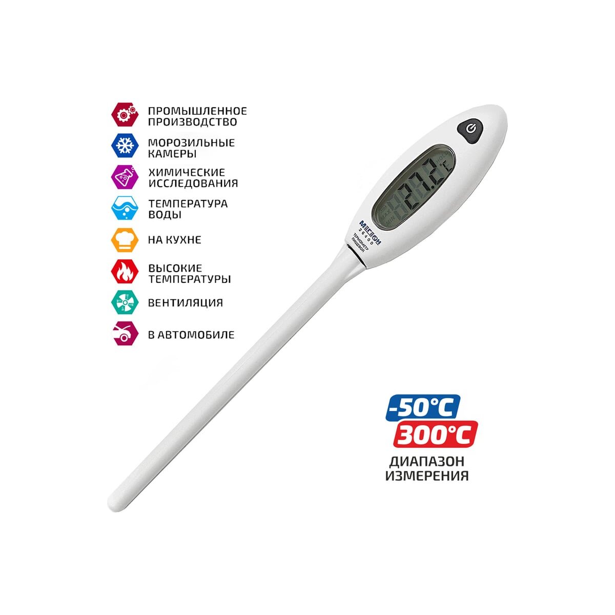 Контактный термометр (тип - игла), в основном используется для измерения температуры пищевых продуктов. Зонд термометра выполнен из нержавеющей стали высшего качества. При помощи термометра с зондом можно точно отслеживать температуру приготовления пищи (в духовке, на гриле, в воде). Термометр также применяют, в различных сферах деятельности (работа с отопительным и холодильным оборудованием, при обработке пластиков и резины). Может также приняться для работы с растениями - поможет узнать температуру у корневища. Простота эксплуатации достигается простому управлению одной кнопкой на панели. Помимо измерения текущих значений температуры предусмотрено удержание максимальных и минимальных показателей нагрева или охлаждения. Благодаря функции автоматического выключения увеличен срок службы батареи.
