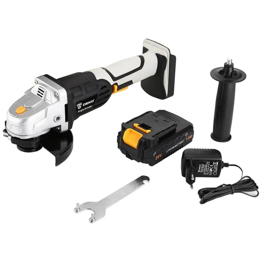 УШМ, вспомогательная ручка, гаечный ключ, батарея, зарядное устройство, руководство по эксплуатации