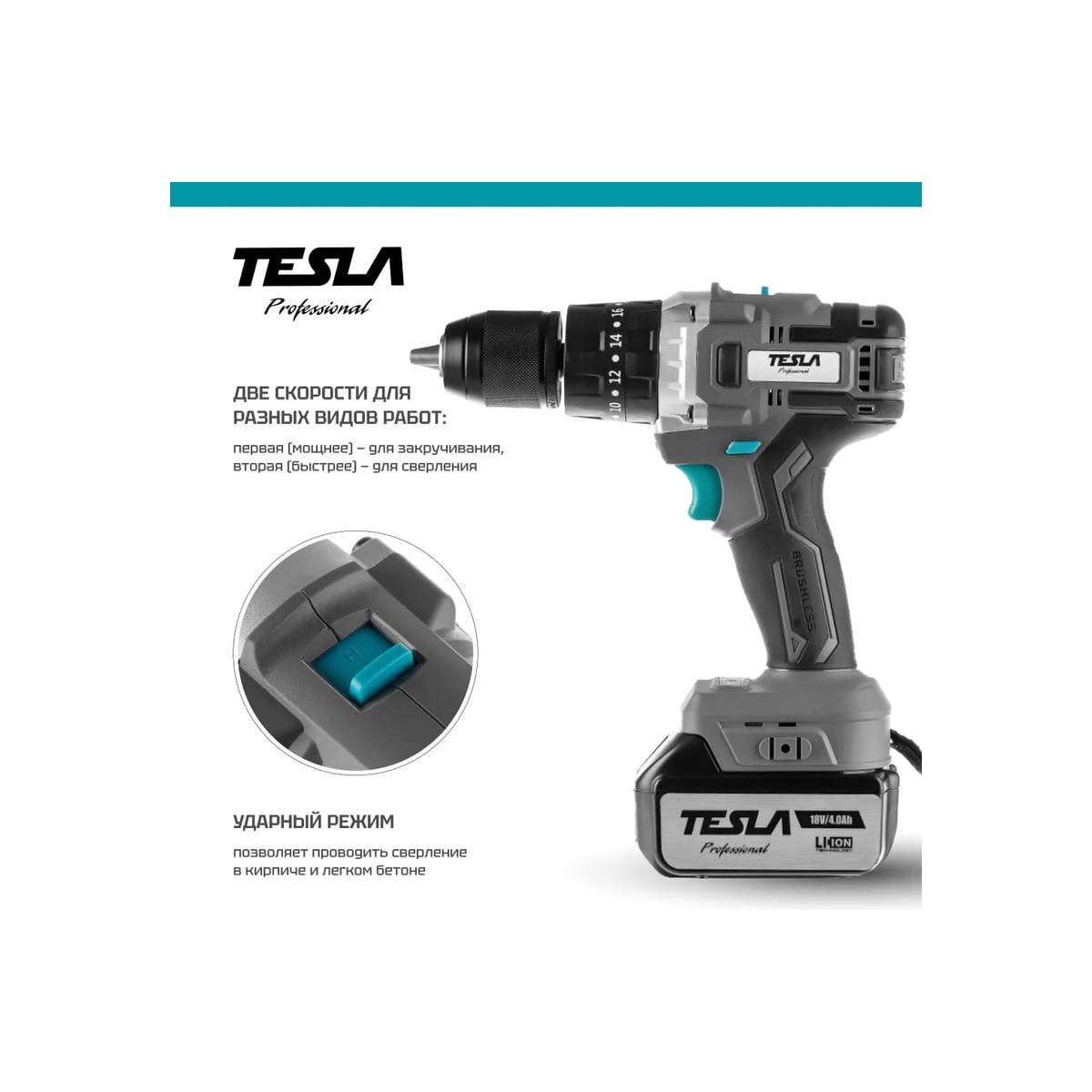 Мощная и производительная ударная дрель-шуруповерт с LiIon аккумулятором оснащена бесщёточным двигателем, что позволяет увеличить ресурс эксплуатации, повысить КПД, снизить энергопотребление.
