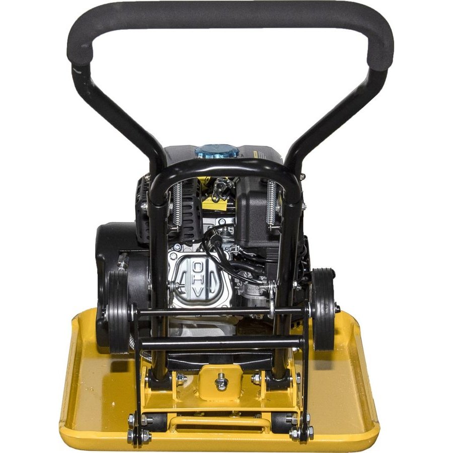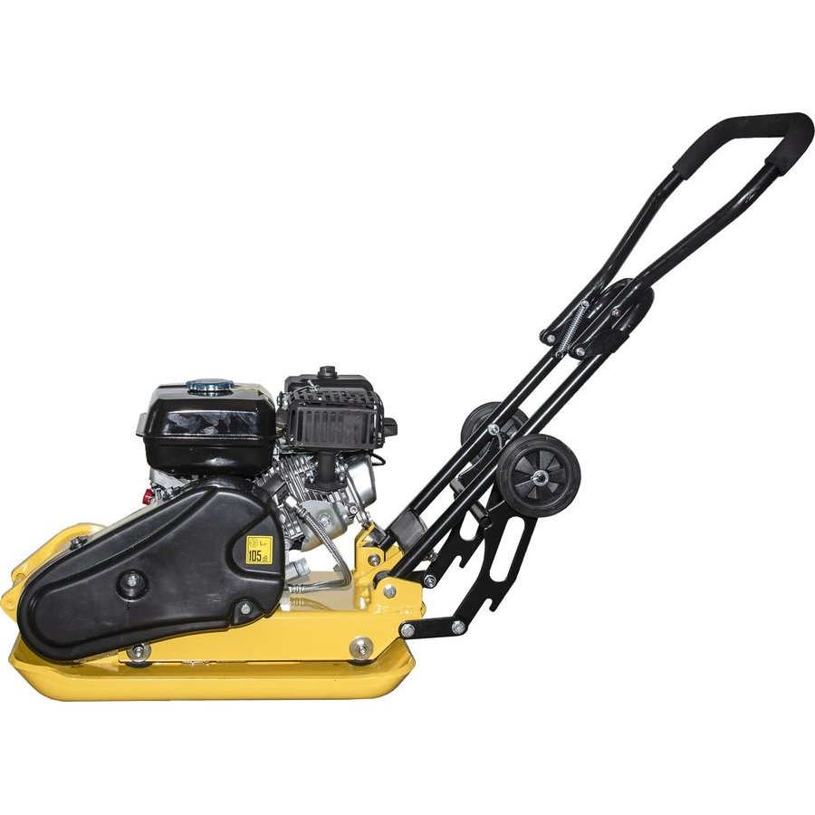 Двигатель виброплиты в сборе с основанием, рукоятка управления, подкатные колеса, крепежный комплект, паспорт изделия.