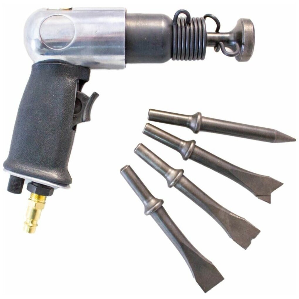 Изделие работает благодаря компрессору, который через шланг подает сжатый воздух в инструмент и приводит в действие ударный механизм.