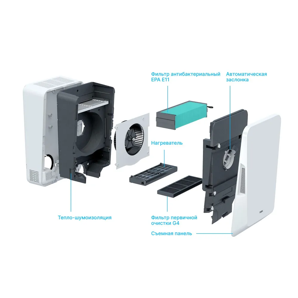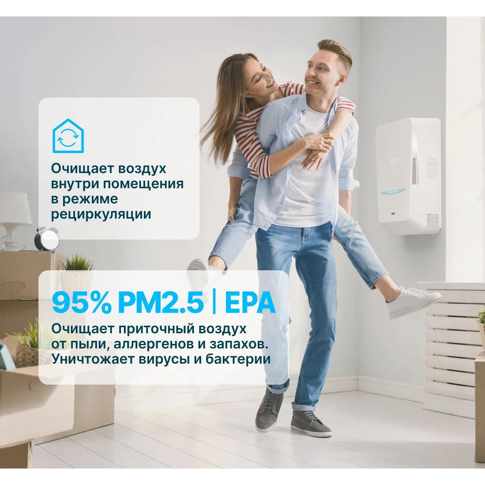 Устройство забирает воздух с улицы, подогревает, пропускает через систему фильтров грубой и тонкой очистки, освобождая от загрязнений, пыли, тонкодисперсных частиц PM2.5, тополиного пуха, пыльцы, спор плесени. Уничтожает вирусы и бактерии на фильтре класса EPA. В помещение поступает чистый свежий воздух комфортной температуры, а в режиме рециркуляции бризер эффективно очистит воздух внутри вашего дома или офиса.