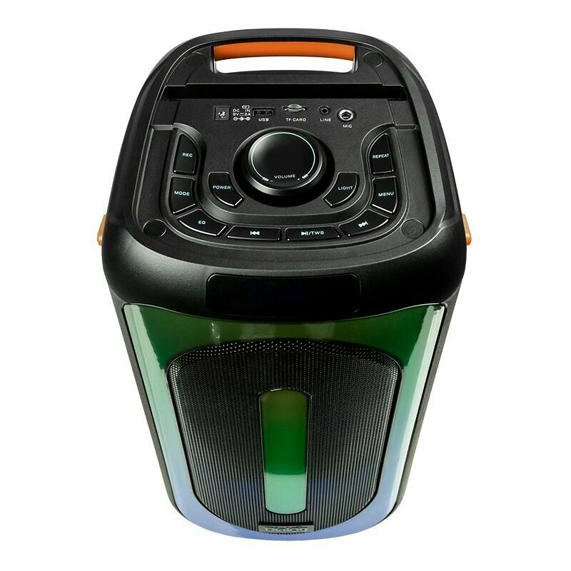Управление на верхней панели: питание, следующая запись/радиостанция, предыдущая запись/радиостанция, воспроизведение/пауза/TWS, выбор режима (источника звука), меню, общая громкость, запись с микрофона, цветомузыка, повтор воспроизведения, эквалайзер