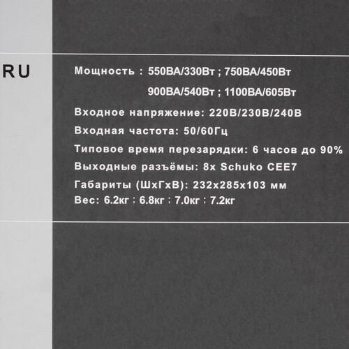 ИБП Powercom Spider SPD-550U LCD представляет собой линейно-интерактивный источник питания для дома и офиса. Устройство в офлайн-режиме защищает от колебаний напряжения, получая питание от сети. Модель рассчитана на подключение бытовой и компьютерной техники общей мощностью 330 Вт (550 ВА). ИБП использует свинцово-кислотную батарею мощностью 12V/7.2Ah, на которую при скачках напряжения он переключается за 4 мс. При полной нагрузке прибор будет работать в течение 13 минут. В состоянии покоя он автоматически заряжает батарею.
