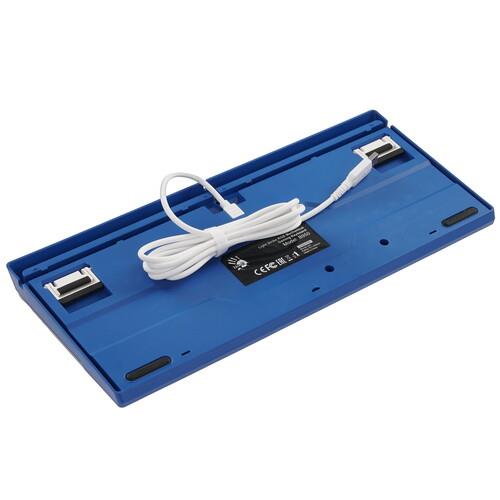 Клавиатура Bloody B950 [1975318] выполнена в бело-синем корпусе. Модель примечательна комбинированной расцветкой кейкапов. На основании расположены выдвижные ножки для регулировки угла наклона. Подключение к компьютеру выполняется по кабелю с интерфейсом USB.