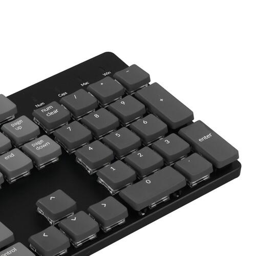Клавиатура Keychron K5SE [K5SE-E4] оснащена тактильными механическими переключателями Keychron Banana Optical Low-Profile с низкопрофильной конструкцией. Короткий ход клавиш обеспечивает минимальный изгиб кистей и снижение усталости при вводе текстовых данных. Модель отличается полноразмерной раскладкой с 104 клавишами, включая цифровой блок.