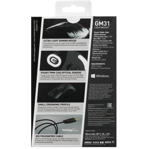 MSI Clutch GM31 Lightweight оснащена 5 программируемыми кнопками и отдельной клавишей для смены чувствительности сенсора. Вы можете выбирать 1 из 6 режимов работы датчика для замедления или ускорения курсора. Встроенная память сохраняет заданные настройки при переключении мыши к другому устройству.
