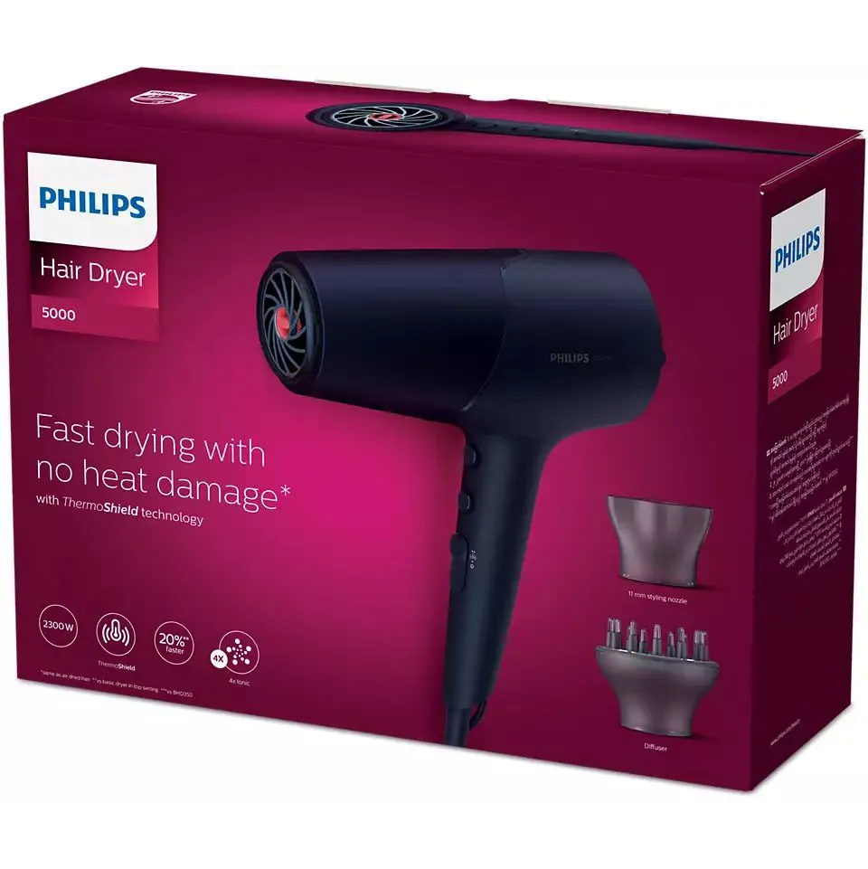 Полноразмерный фен Philips BHD510/03 поможет сделать красивую прическу, как в салоне. Мощный поток воздуха быстро высушивает волосы и облегчает укладку. Прибор дополнен технологией ThermoShield для выбора оптимальной температуры и защиты от пересушивания. Благодаря генератору ионов вы получаете послушные, прямые и блестящие локоны. Устройство Philips BHD510/03 со стильным темно-синим корпусом и удобной ручкой оснащено двумя насадками (диффузор, концентратор). Петля для подвешивания упрощает хранение фена. Прибор с независимой регулировкой имеет 2 скорости и 4 уровня нагрева, включая подачу холодного воздуха для фиксации укладки. Имеется надежная защита от перегрева.