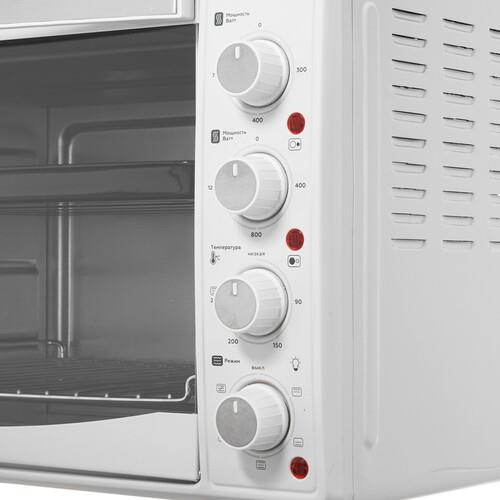 Конфорки прибора BQ EO4205WGP с пятью рабочими режимами действуют с мощностью 700 Вт и 1200 Вт, а духовка нагревается до 90-250 °C. Оборудование оснащено ярким рабочим индикатором и термостатом. Данная модель поставляется с решеткой и противнем со съемной рукояткой, вертелом с ручкой, весит 10.96 кг и обладает размерами 56x36.9x40.9 см.
