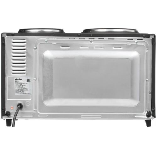 Кроме того, в электропечи Simfer M 3542 имеется духовка объемом 35 литров, оснащенная противнем и решеткой. За счет большей мощности (1200 Вт) духовка нагревается до заданной температуры очень быстро. Диапазон температуры нагрева составляет 40-240 °С. Выбирать нужную, а также задавать другие параметры можно при помощи поворотных механизмов. Размещение нагревательных элементов сверху и снизу обеспечивает более равномерный нагрев пространства духовки, а значит и лучшее пропекание каждого блюда. Всего в духовке 3 режима нагрева.