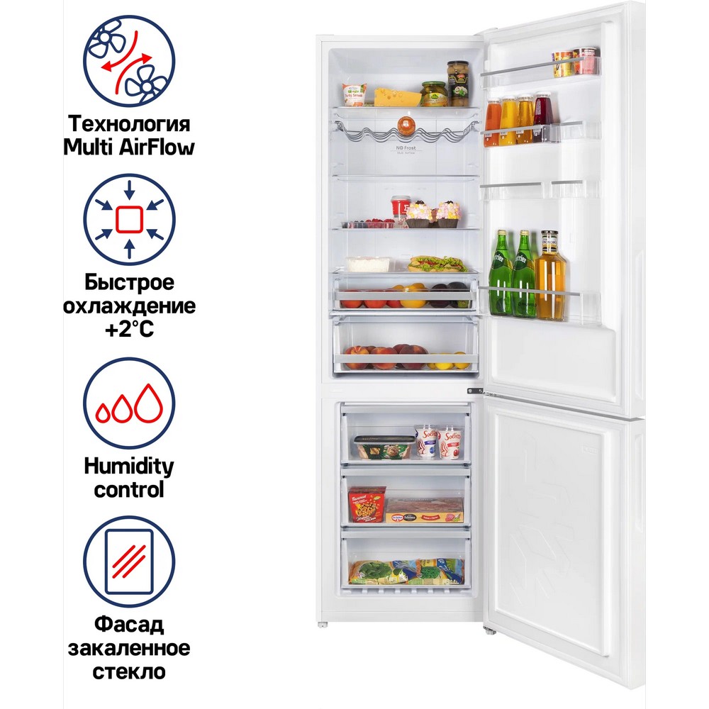 индикация температуры, система контроля влажности, Full No Frost, Антибактериальное покрытие камеры, Дисплей, Зона свежести, Светодиодная подсветка, Скрытые ручки, Суперохлаждение