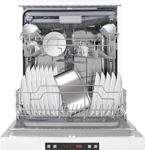 Эта **полноразмерная**, отдельностоящая модель. Она оснащена электронным управлением. Внутри три корзины. Вместимость – до 14 комплектов посуды.