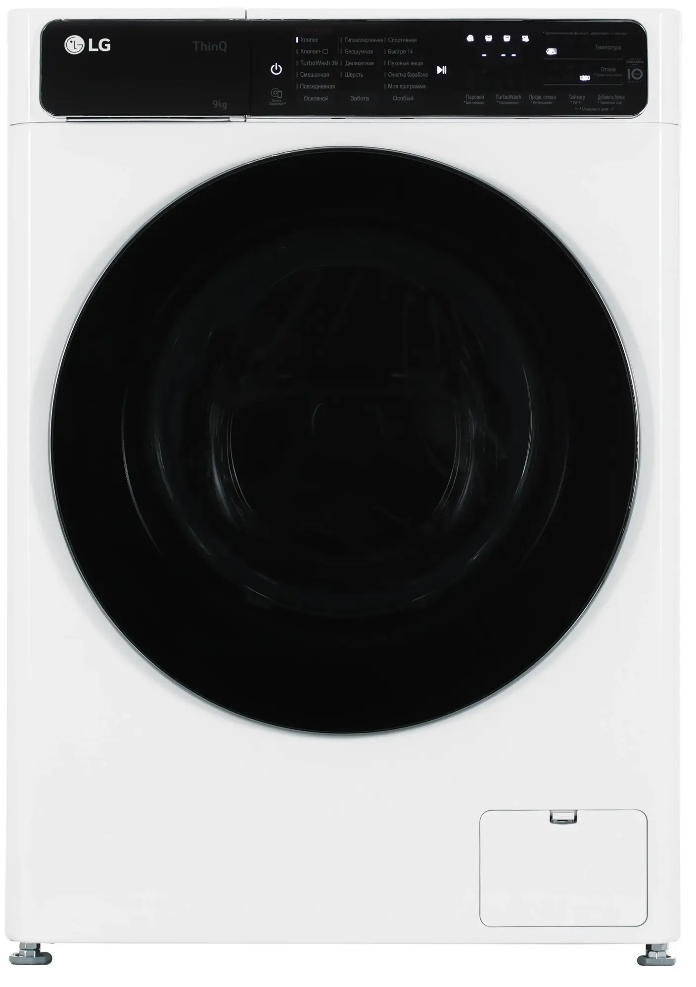 Стиральная машина с фронтальной загрузкой LG F2T9FW9W белого цвета вмещает в себя до 9 кг белья и подходит для семьи из 3-4 человек. Модель предлагает 14 программ стирки: TurboWash 39, «Бесшумная», «Быстро 14», «Гипоаллергенная», «Деликатная», «Моя программа», «Очистка барабана», «Повседневная», «Пуховые вещи», «Смешанная», «Спортивная», «Хлопок», «Хлопок макс.», «Шерсть».