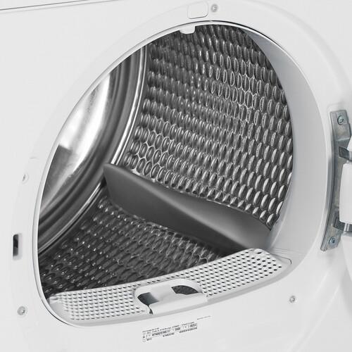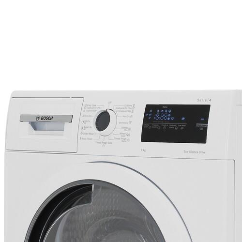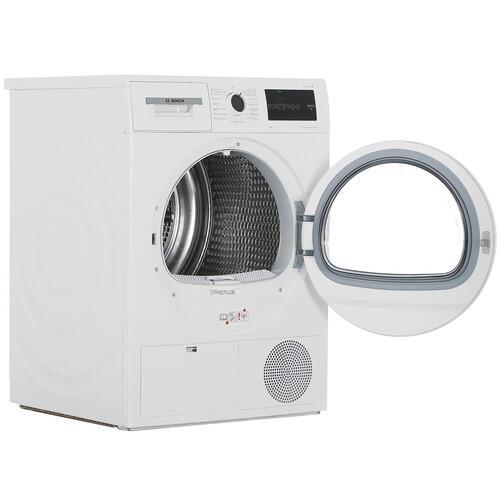 Сушильная машина Bosch WTN86201ME белого цвета имеет размеры 59.8x84.2x61.3 см. С учетом выступающих элементов глубина корпуса ‒ 41.3 см. Модель поддерживает конденсационную сушку, при которой воздух внутри барабана нагревается и испаряет из вещей влагу. Встроенный теплообменник превращает водяной пар в конденсат для сбора в емкость и слива в канализацию. Прибор рассчитан на загрузку 8 кг белья: по завершении цикла вы достаете из барабана сухие вещи.