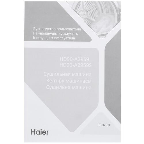 На панели управления Haier HD90-A2959S расположены сенсорные кнопки и поворотный механизм для простого выбора необходимых параметров. Таймер отложенного запуска позволяет программировать определенное время начала сушки. Сушильная машина отличается высокой энергоэффективностью благодаря классу А++ и оснащена технологией защиты от перегрева.
