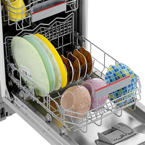На панели управления из нержавеющей стали расположены электронные кнопки и цифровой дисплей. Функция Home Connect предоставляет возможность удаленной настройки параметров посудомоечной машиной Bosch SPV4HMX65Q через приложение на смартфоне по Wi-Fi. Инверторный двигатель EcoSilence Drive за счет отсутствия щеток обеспечивает тихую работу и экономичное потребление энергии. Система AquaStop перекрывает подачу воды при обнаружении неисправности шланга и протечек в корпусе.