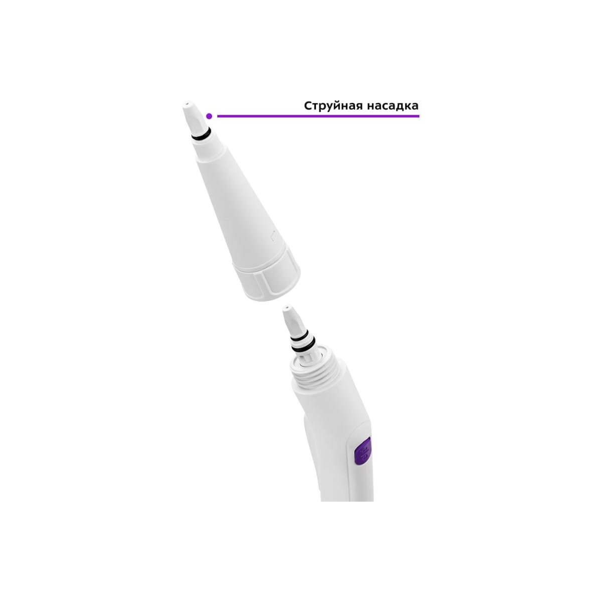 Можно использовать пароочиститель как с насадками, так и без насадок. Для подсоединения струйной насадки установите ее на паровое сопло пистолета до упора и поворачивайте кольцо струйной насадки справа налево для фиксации.