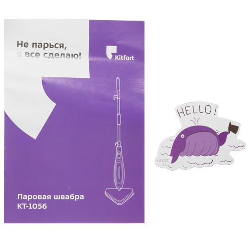 Пароочиститель Kitfort КТ-1056 способен устранять загрязнения и дезинфицировать обрабатываемые поверхности благодаря воздействию горячего пара. Прибор выполнен в виде швабры и оснащен 2 сменными мягкими тряпками для деликатной обработки гладких напольных покрытий. Они фиксируются на насадке при помощи липучек. Для чистки ковровых изделий предусмотрена специальная рамка.