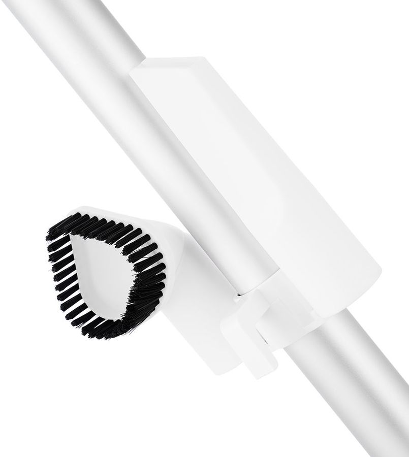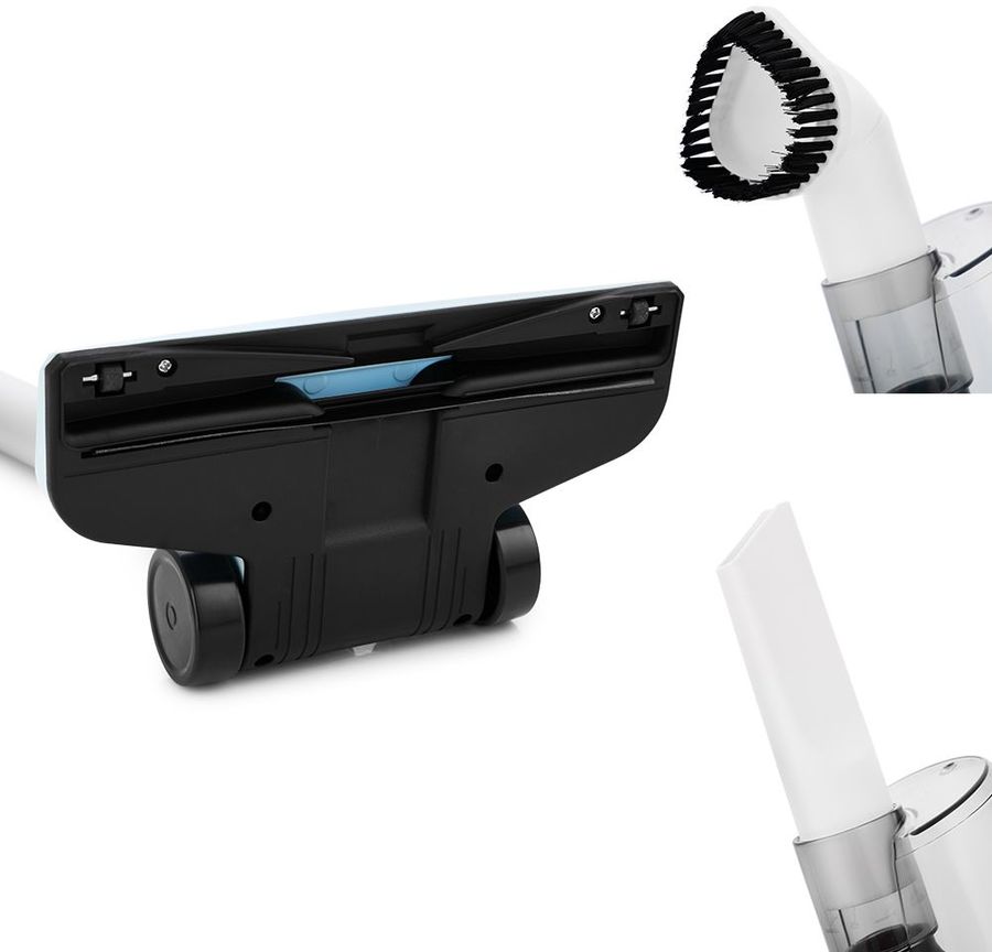 Насадки в комплекте: напольная щётка для уборки плоских напольных покрытий, узкая насадка для уборки углов и щелей, ворсовая насадка для чистки мягкой мебели.