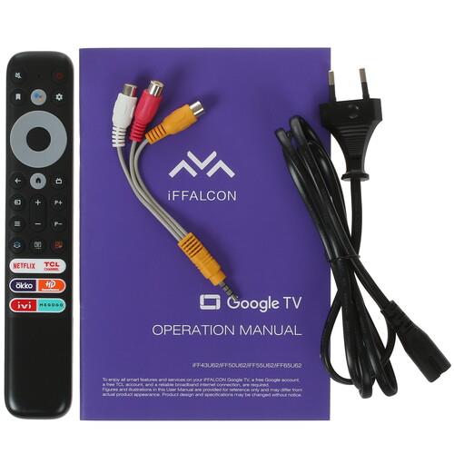 iFFALCON IFF43U62 оснащен платформой Smart TV под управлением Google TV с поддержкой голосового ассистента. Телевизор предусматривает запуск различных приложений, сервисов, фильмов и прочего контента в сети Интернет, доступ к которой осуществляется с помощью Wi-Fi. Также имеются беспроводная синхронизация по Bluetooth и ряд проводных интерфейсов. Тонкая рамка помогает максимально сосредоточиться на изображении.