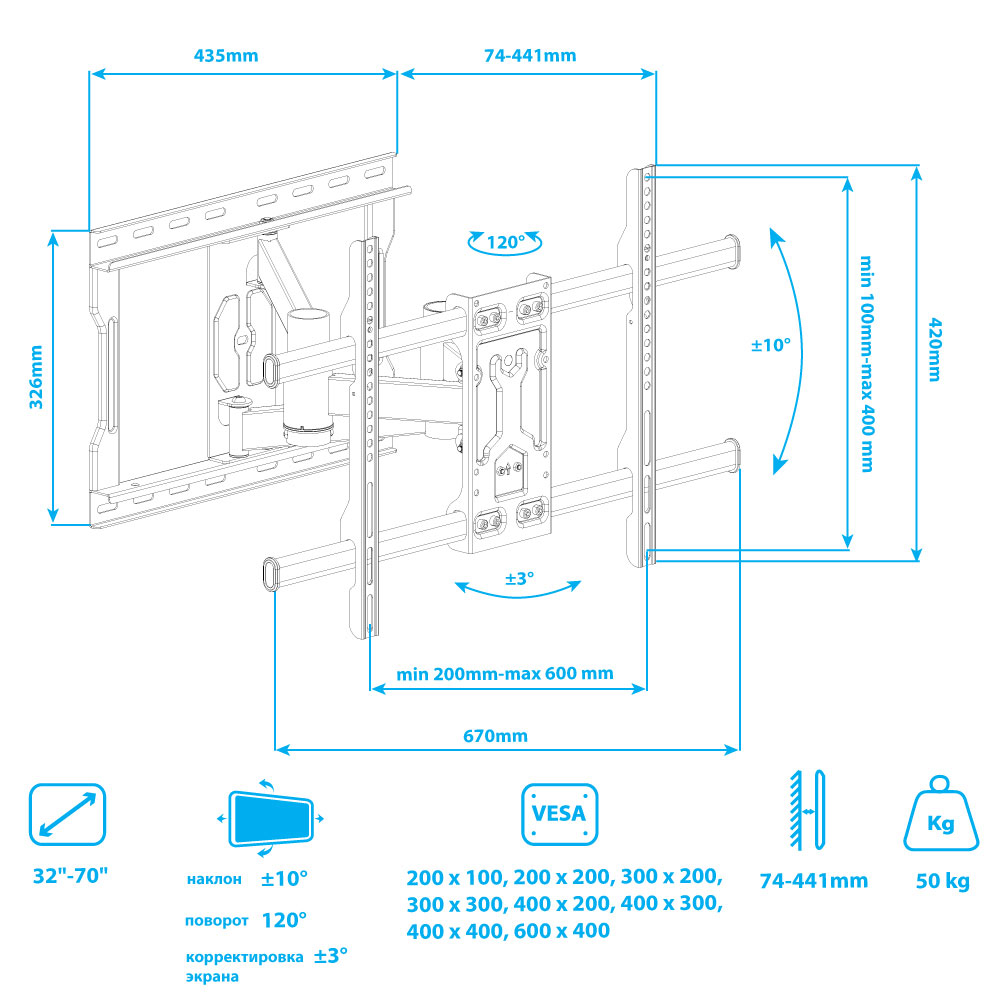 Надежная стальная конструкция максимальная нагрузка до 50 кг, Легкий монтаж при помощи съемной монтажной платформы, Универсальный - телевизор на кронштейне можно наклонить, повернуть и сдвинуть к стене , Корректировка экрана уникальная возможность вращения экрана на ±3° относительно стены