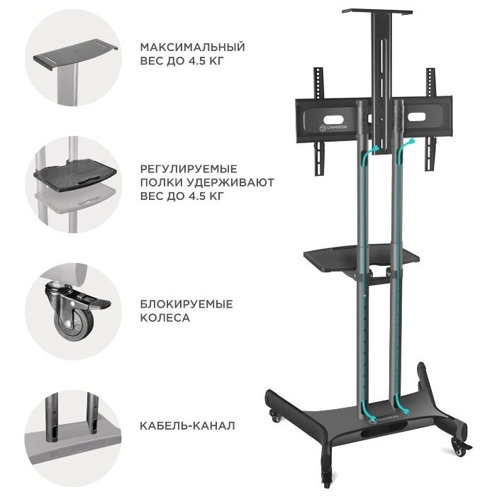 Дополнительная информация: регулировка высоты: 1200~1500 мм; кабель-канал внутри столбов, регулировка полки по высоте; оснащена колёсиками с блокировкой движения; материал: холоднокатаная сталь (SPCC class)