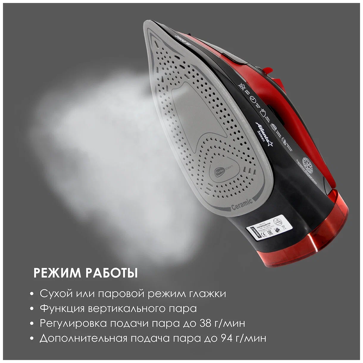 Дополнительные функции: сухая глажка, система самоочистки, регулировка подачи пара, паровой удар, функция разбрызгивания