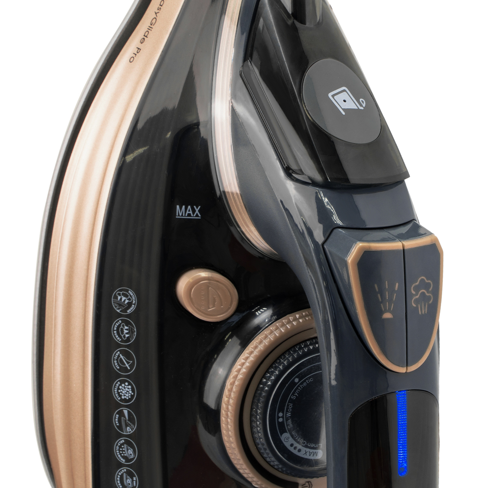 Керамическое покрытие EasyGlide Pro обеспечивает легкое скольжение по ткани, защищая материалы от повреждений. Резервуар объемом 300 мл подходит для комфортной глажки без частого долива воды. Подача пара до 80 г/мин эффективно разглаживает складки, а мощный паровой удар до 240 г/мин справляется даже с самыми сложными тканями.