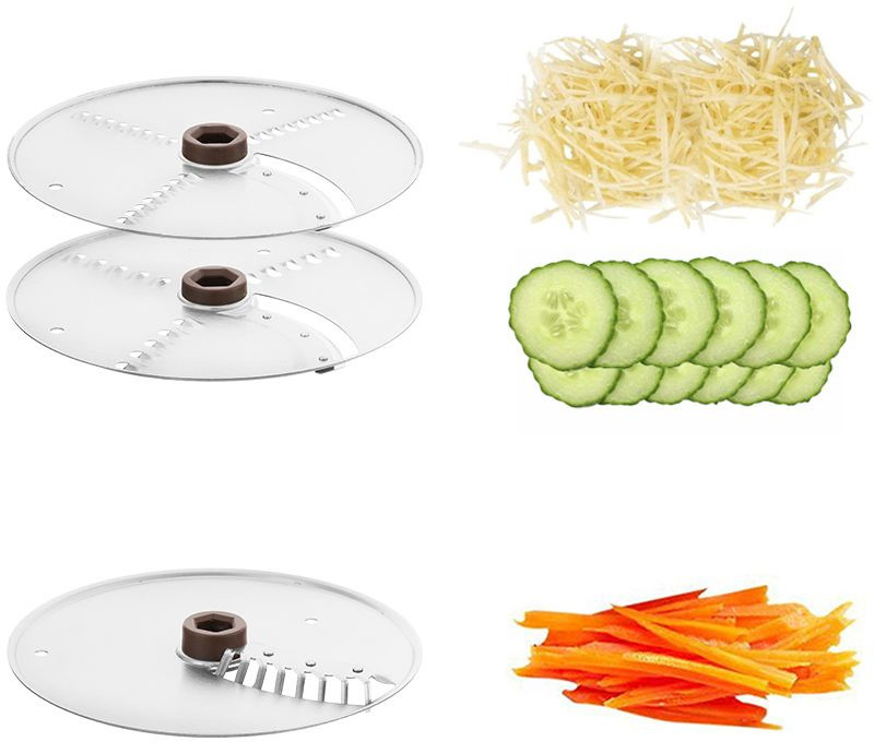 Комплектация: В комплекте с прибором идут 2 ножа «2 в 1» (тёрка и шинковка) и нож для нарезки соломкой. Прибор отлично справится с овощами, фруктами, сыром и другими продуктами.