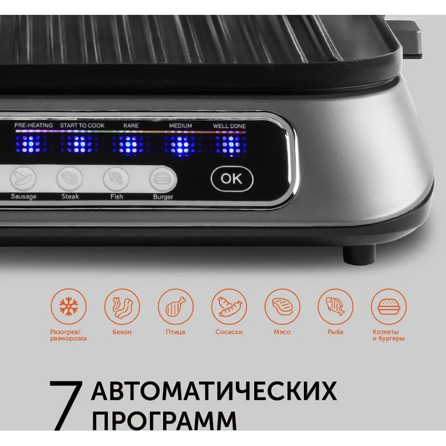 • разогрев/размораживание, • жарка бекона, • приготовление котлет и гамбургеров • приготовление мяса; • приготовление птицы, • готовка сосисок и колбасок; • готовка рыбы