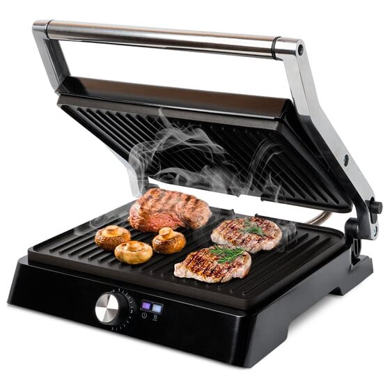 Электрогриль оснащён термостатом для поддержания постоянной температуры панелей и индикаторами, показывающими наличие питания, а также включение и отключение нагрева.