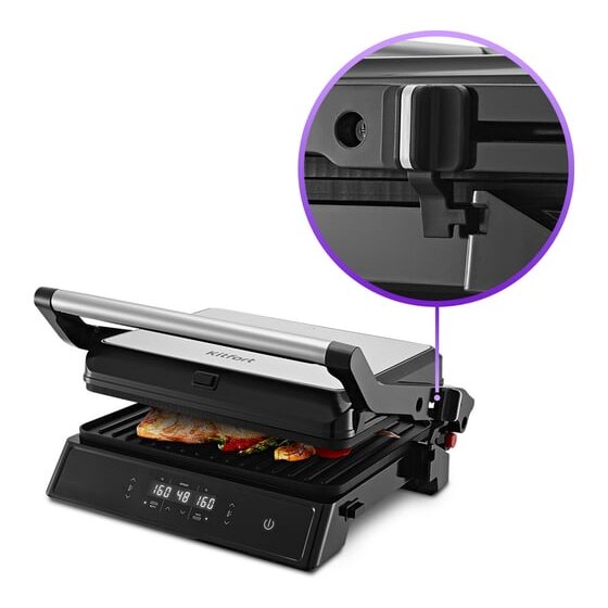 Специальный фиксатор сбоку гриля удерживает крышку в закрытом состоянии, что делает готовку, транспортировку и хранение более удобными.