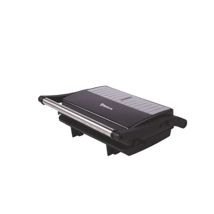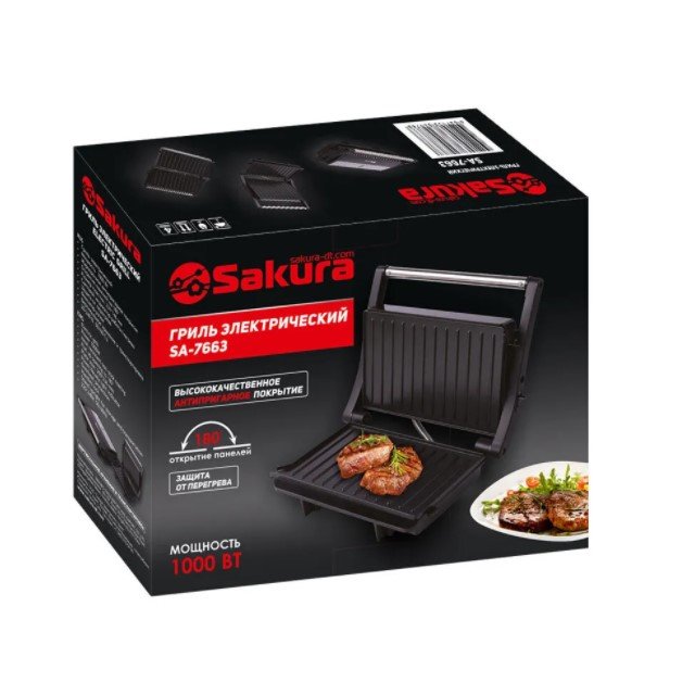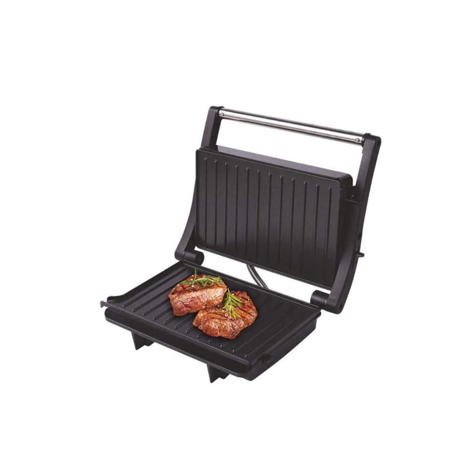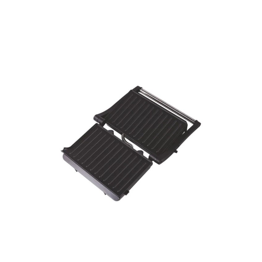 2 рифленые панели для жарки, размер панели 23.1х14.6 см, антипригарное покрытие, открытие панелей на 180° (возможность приготовления на 2 пластинах одновременно), индикатор работы, прорезин. ножки. Корпус из нержавеющей стали и термостойкого пластика.