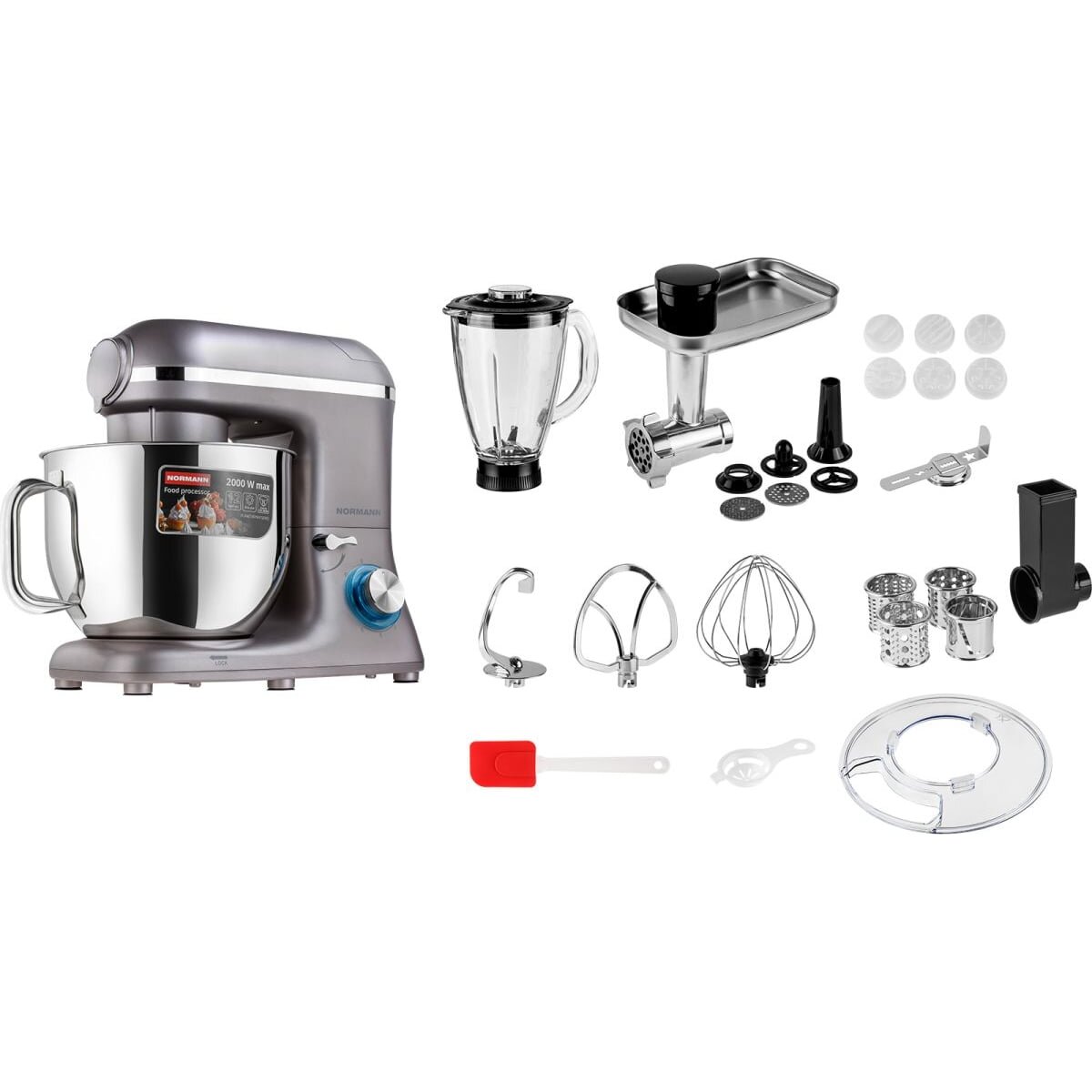 Насадка-крюк для теста, Насадка для замешивания, Насадка-венчик, Решетки для мясорубки (3/5/7 мм), Насадки для овощерезки (4 шт.), Насадка для колбас, Насадка для кеббе, Насадки для макарон (6 шт.), Насадка для печенья