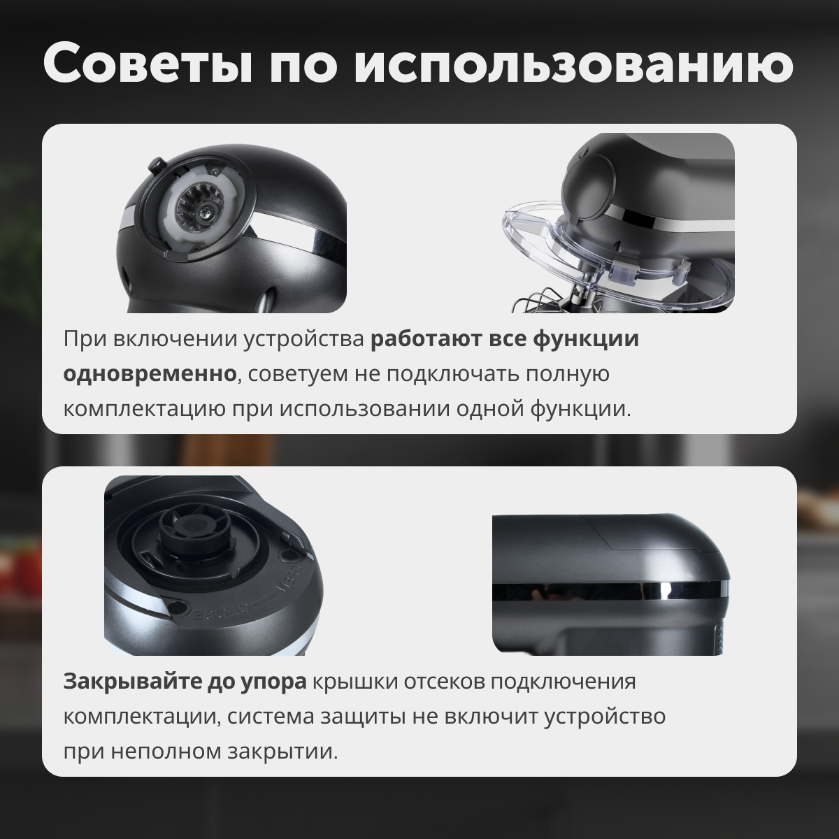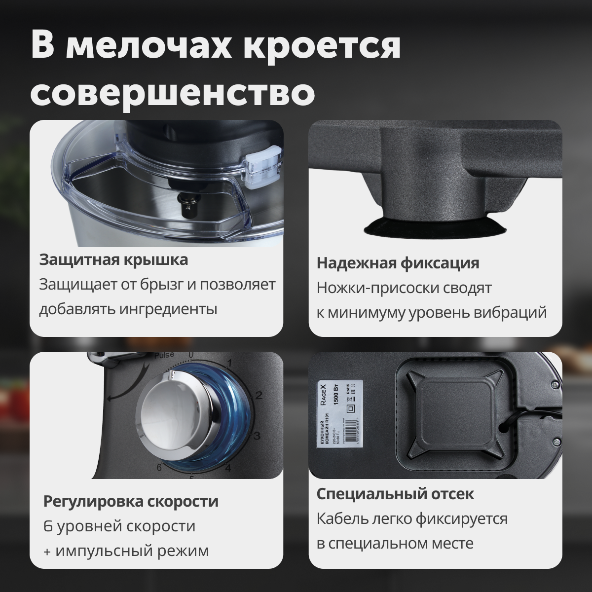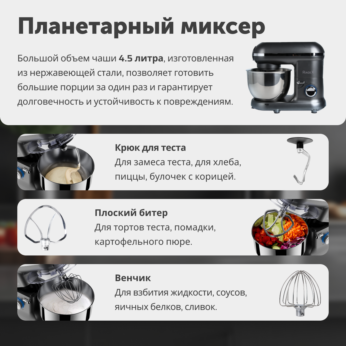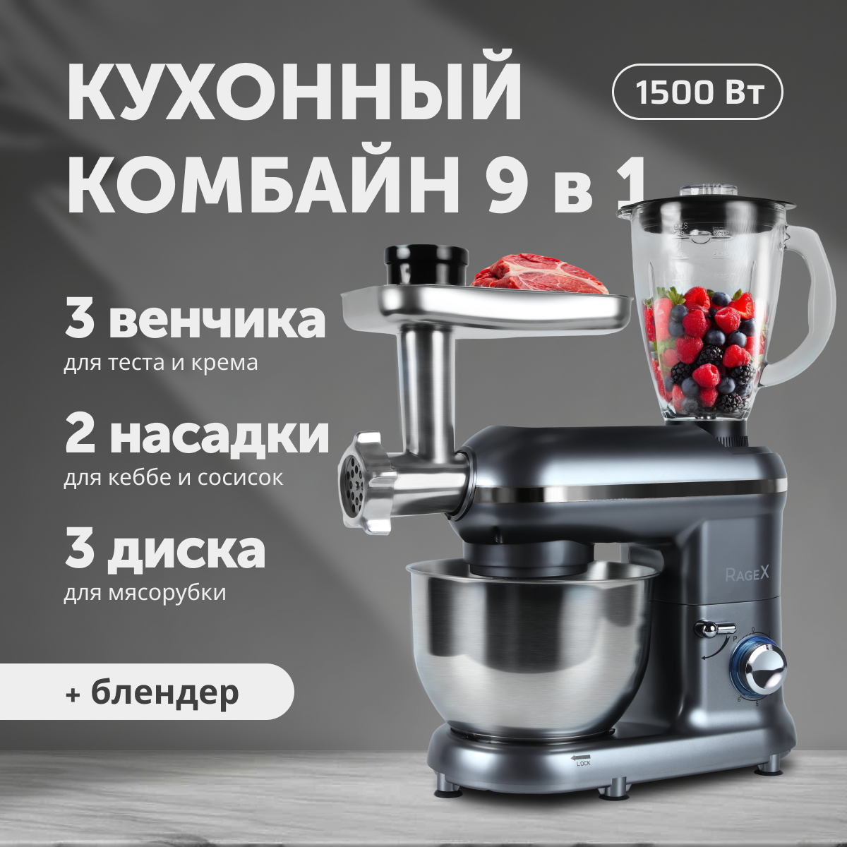 Типкухонная машинаПотребляемая мощность, в Вт1500Тип управленияповоротныйОбъем чаши, в литрах4.5Материал чашинержавеющая стальБлендерДаМатериал кувшина блендерастеклоОбъем блендера, в литрах4.5МясорубкаДаКоличество насадок3Насадкивенчик для взбивания; крюк для теста; насадка для перемешиванияИндикацияотсутствуетПлавный запуск двигателяНетЗащитаот перегреваСтрана-производительКитайУправлениеПланетарное вращениеДаКоличество скоростей6Плавная регулировка скоростиДаИмпульсный режим работыДаКорпусЦветсеребристыйМатериалпластикДлина сетевого шнура, в метрах1Прорезиненные ножкиДаКомплектацияКомплект поставкиКомбайн кухонный, насадки (крюк для теста, плоский битер, венчик для взбивания), чаша металлическая, чаша блендера, мясорубка с 3 решетками и 1 ножом, металлический лоток для мясорубки, инструкция по использованию кухонного комбайна с мясорубкой, плотная упаковка для комбайна.Размеры и весВес, в кг7.55Высота, в см31.8Ширина, в см23.4Глубина, в см38.2