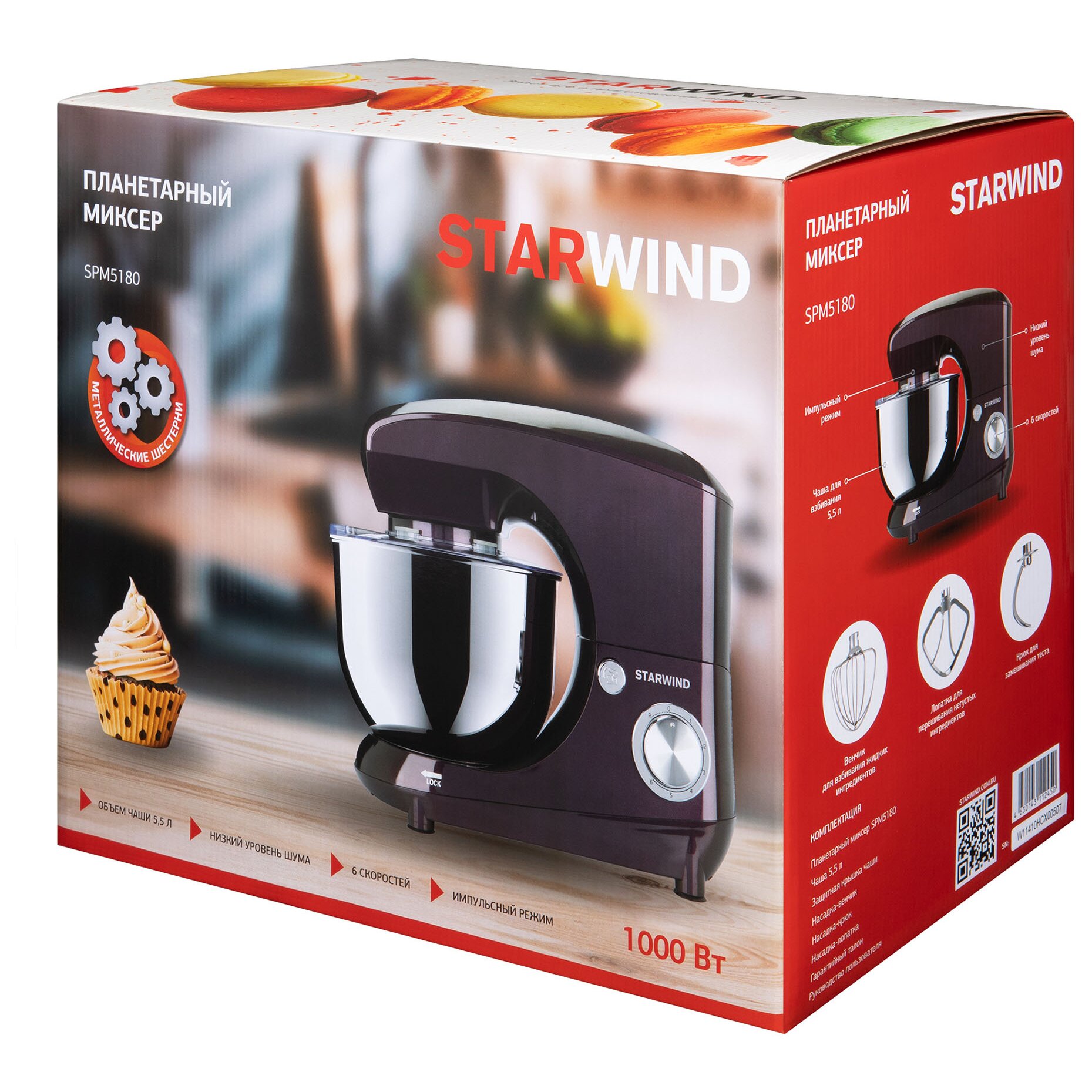 Планетарный миксер Starwind SPM5180 – функциональная модель, которая гарантирует быстрое смешивание ингредиентов и устранение комочков в креме, муссе и соусе. Станет помощником каждой хозяйке, которая оценит его по достоинству. Мощность современного планетарного миксера составляет порядка 1000 Ватт, а объем предусмотренной в конструкции чаши равен 5,5 литра. Имеется шесть скоростных режимов, а принцип действия основан на планетарном вращении. Корпус изготовлен из прочного пластика, выполнен в ежевичном цвете. В комплекте есть три насадки, ножки прорезиненные.
