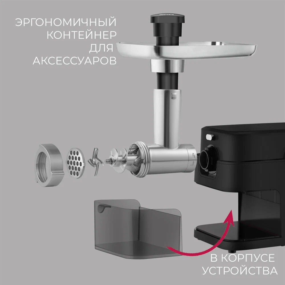 Технические характеристикиБрендRondellЦвет товарачерныйНоминальная мощность2000 ВтМаксимальная мощность (при блокировке мотора)2000 ВтСистема реверсаестьОсобенностизащита от перегрузки, отсек для хранения насадок, прорезиненные ножкиМатериал корпусапластикДлина сетевого шнура1 мНасадкиНасадкидиск для фарша, насадка для кеббе, насадка для приготовления колбасКоличество перфорированных дисков3