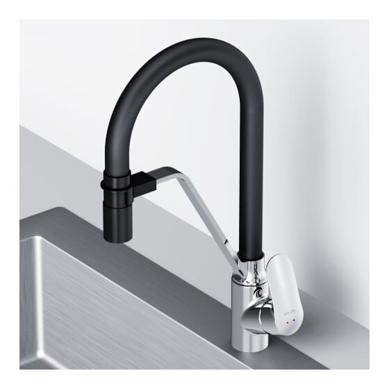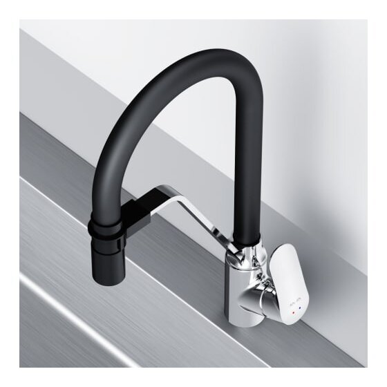 Гибкий излив значительно расширяет зону использования смесителя, гарантирует легкий уход за мойкой и наполнение емкостей любого размера. Устойчив к загрязнениям, перегибам и внешним воздействиям. Удобный магнитный притягиватель для фиксации излива.