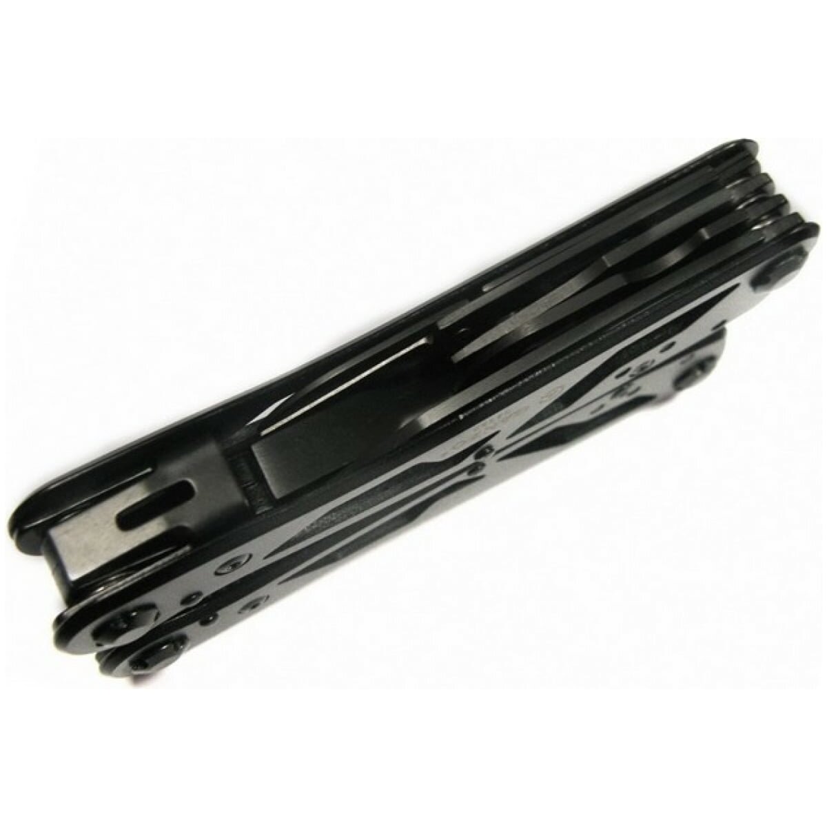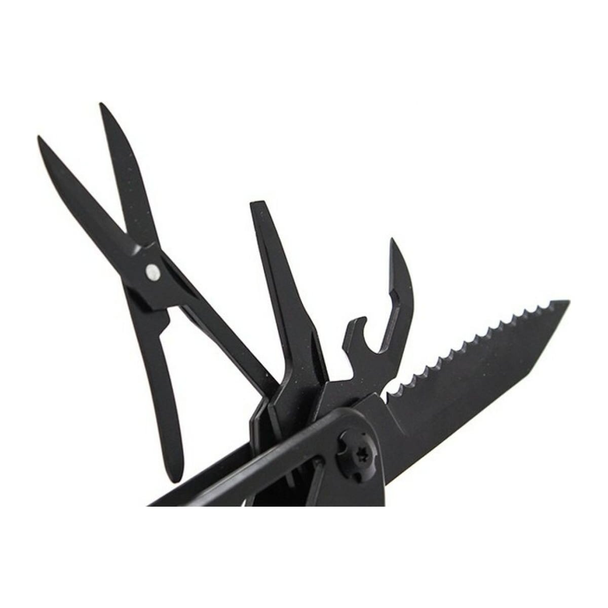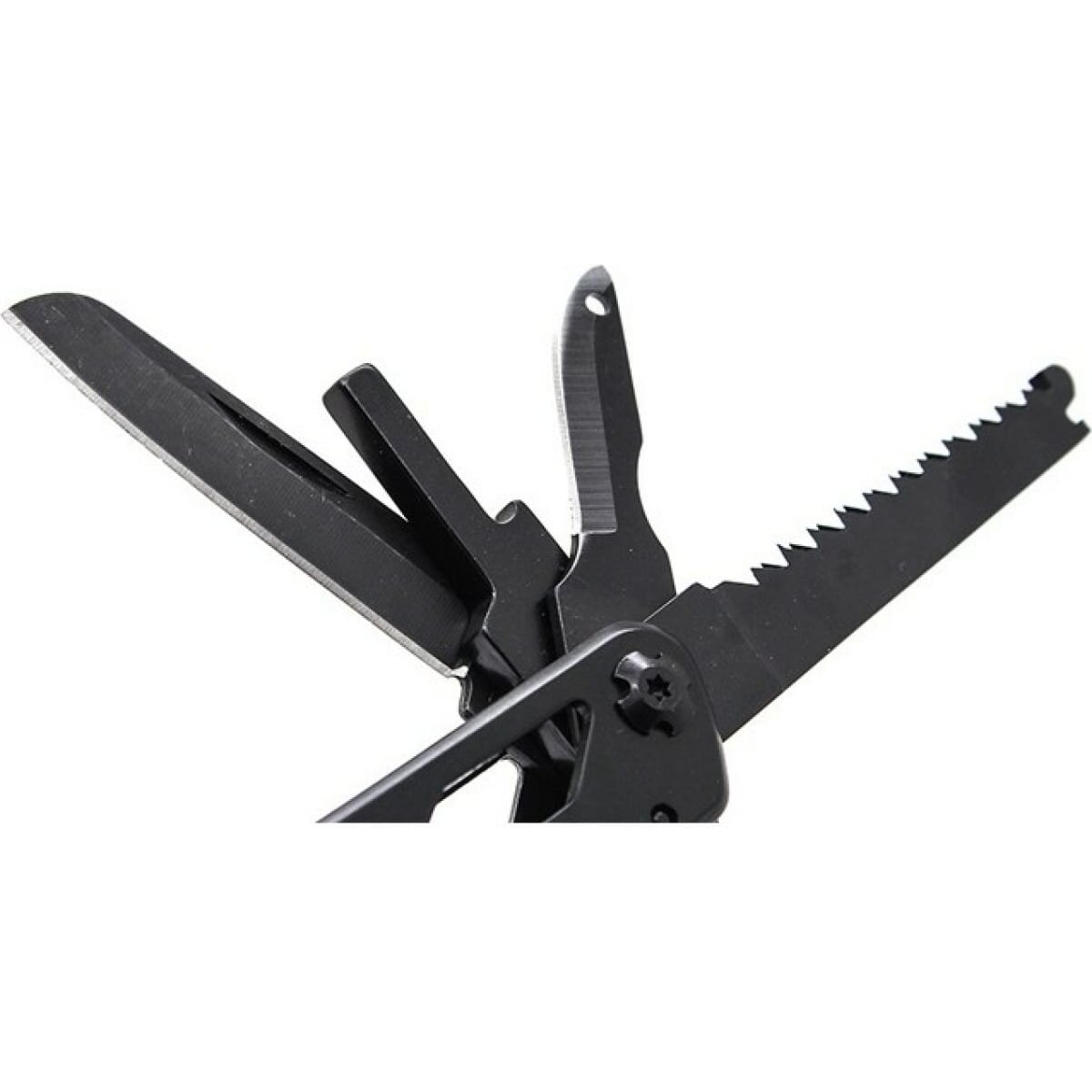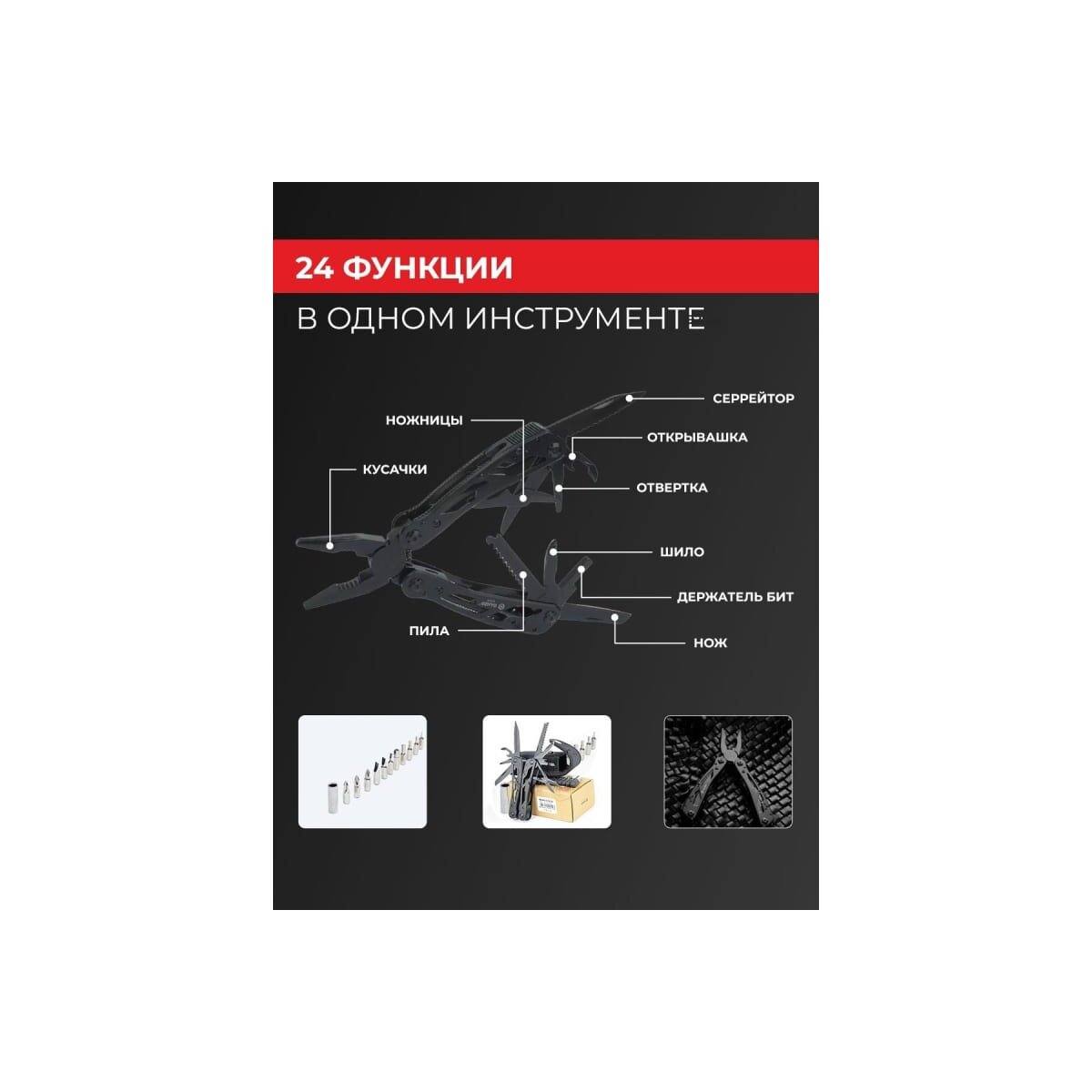плоскогубцы,кусачки,маленькая отвертка плоская,нож,серрейтор,консервный нож,открывалка для бутылок,для снятии изоляции,пила,захват для гаек и цилиндров,ножницы,шило,держатель бит,12 сменных насадок
