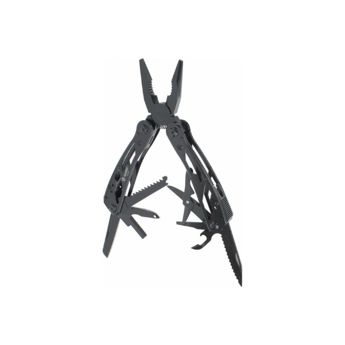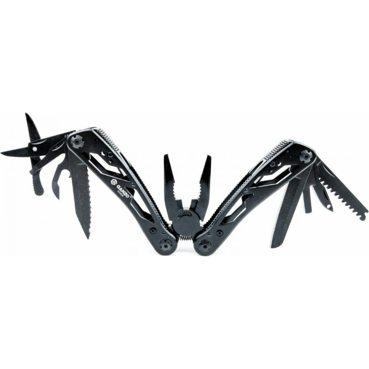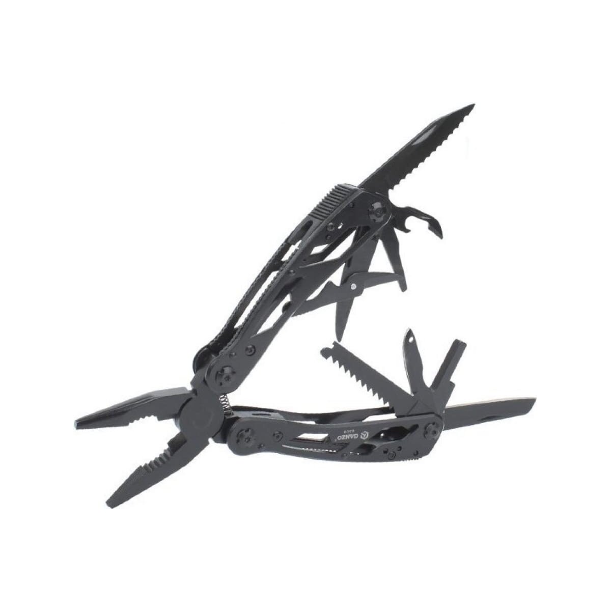 Стильный мультитул G202B от компании Ganzo. Модель имеет продуманный дизайн и большой набор инструментов. В комплект входят следующие предметы: подпружиненные плоскогубцы с кусачками, два лезвия, одно из которых имеет серрейторную заточку, плоская отвертка небольшого размера, ножницы, ножовка по дереву, зенковка, удлинитель адаптера для бит открывалки для бутылок и консервов.
